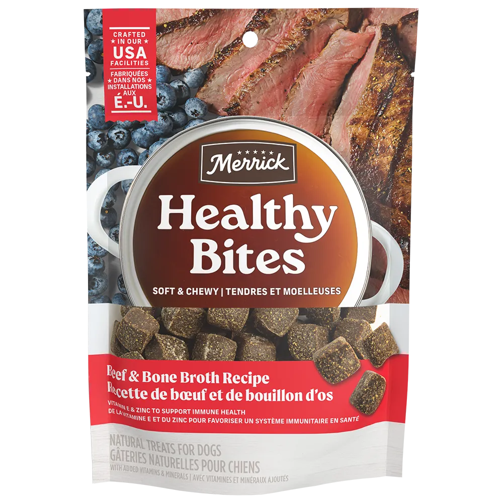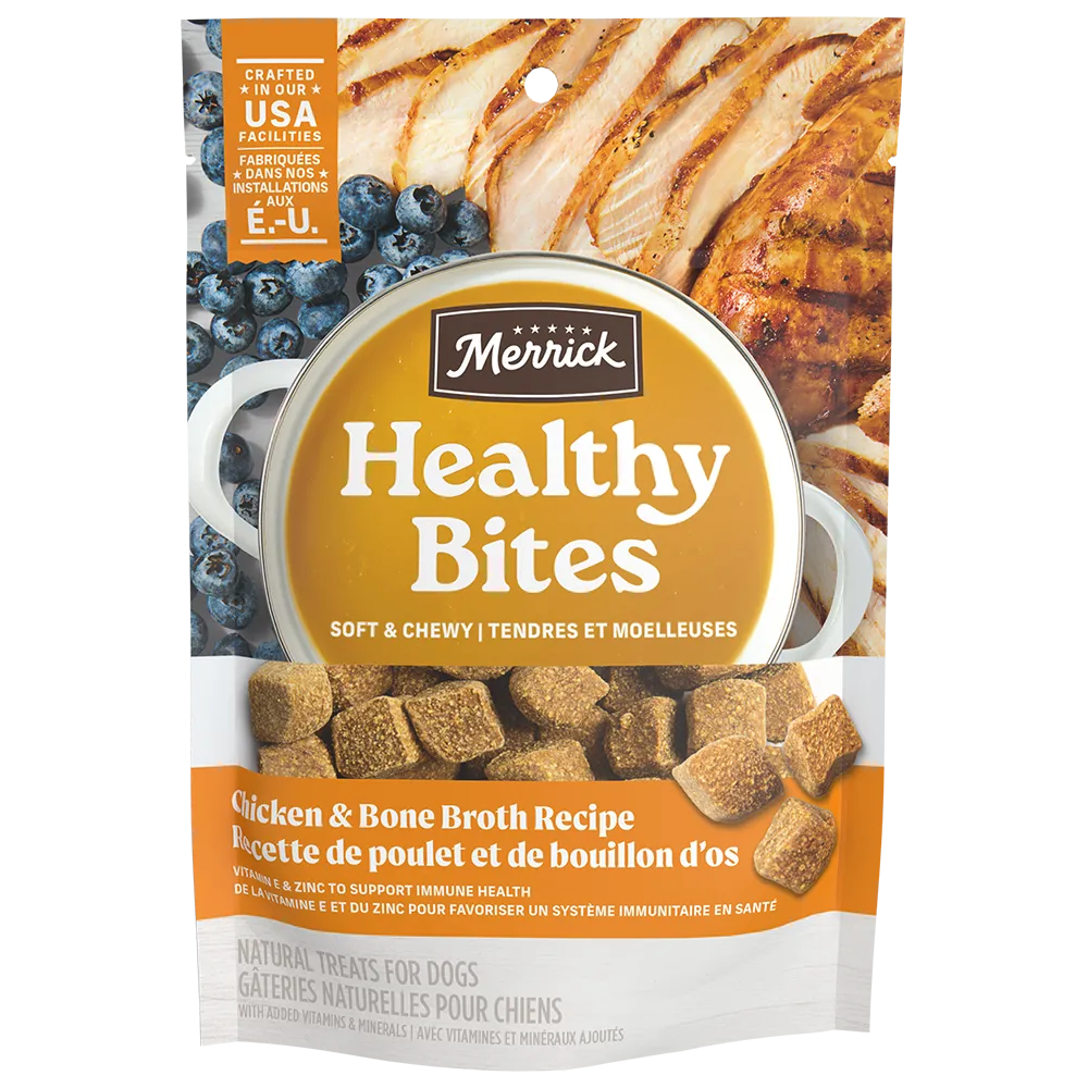 Merrick Healthy Bites Bone Broth dog treats are soft and chewy, grain free dog treats made to reward your dog without compromise. Healthy Bites natural dog treats with added vitamins and minerals are made with real deboned chicken or beef, containing vitamin E and zinc to support immune health. These bone broth dog treats also contain accents of blueberries, cinnamon, and turmeric creating an extra special treat. Browse our recipes today.