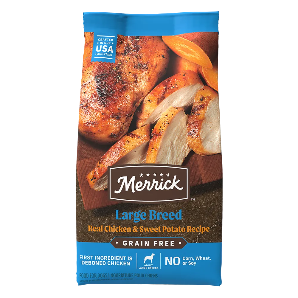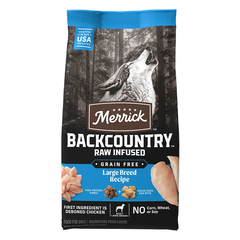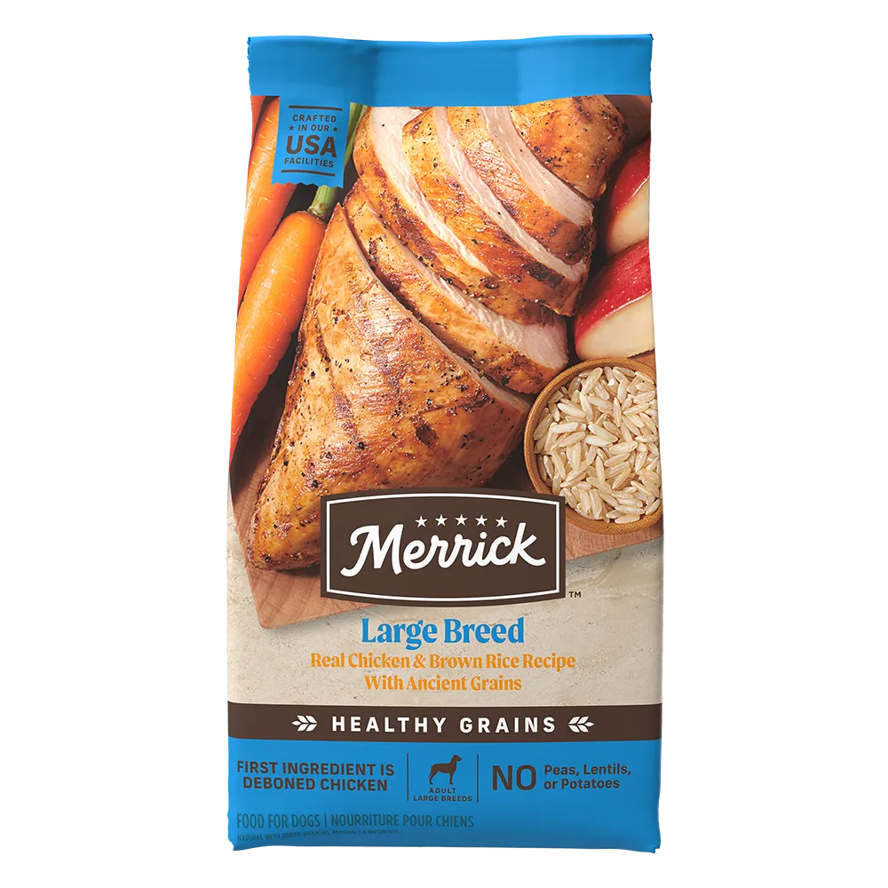 Merrick large breed dog food recipes have been crafted to support the needs of bigger dogs. Your large breed dog can find the balanced nutrition they need with our Large Breed specific recipes. With Healthy Grains recipe, Grain Free recipe, and Backcountry recipe for large breed dogs all have high levels of Omega-6 and Omega-3 fatty acids to support healthy skin and coat. These recipes for big dogs have protein-packed kibble balanced with vitamins, minerals, nutrients, and other natural ingredients to give your dog all the nutrients required. Backcountry Large Breed recipe has additional freeze-dried raw pieces that are mixed into the kibble and taste great. Explore these food options to find the best large breed dog food for your big companion.