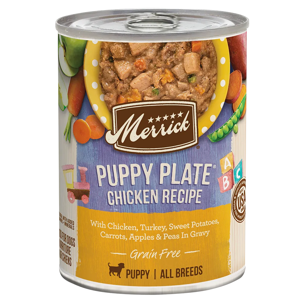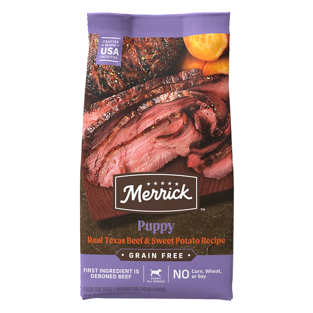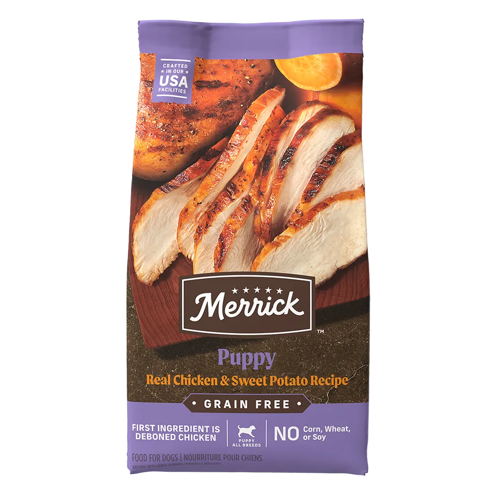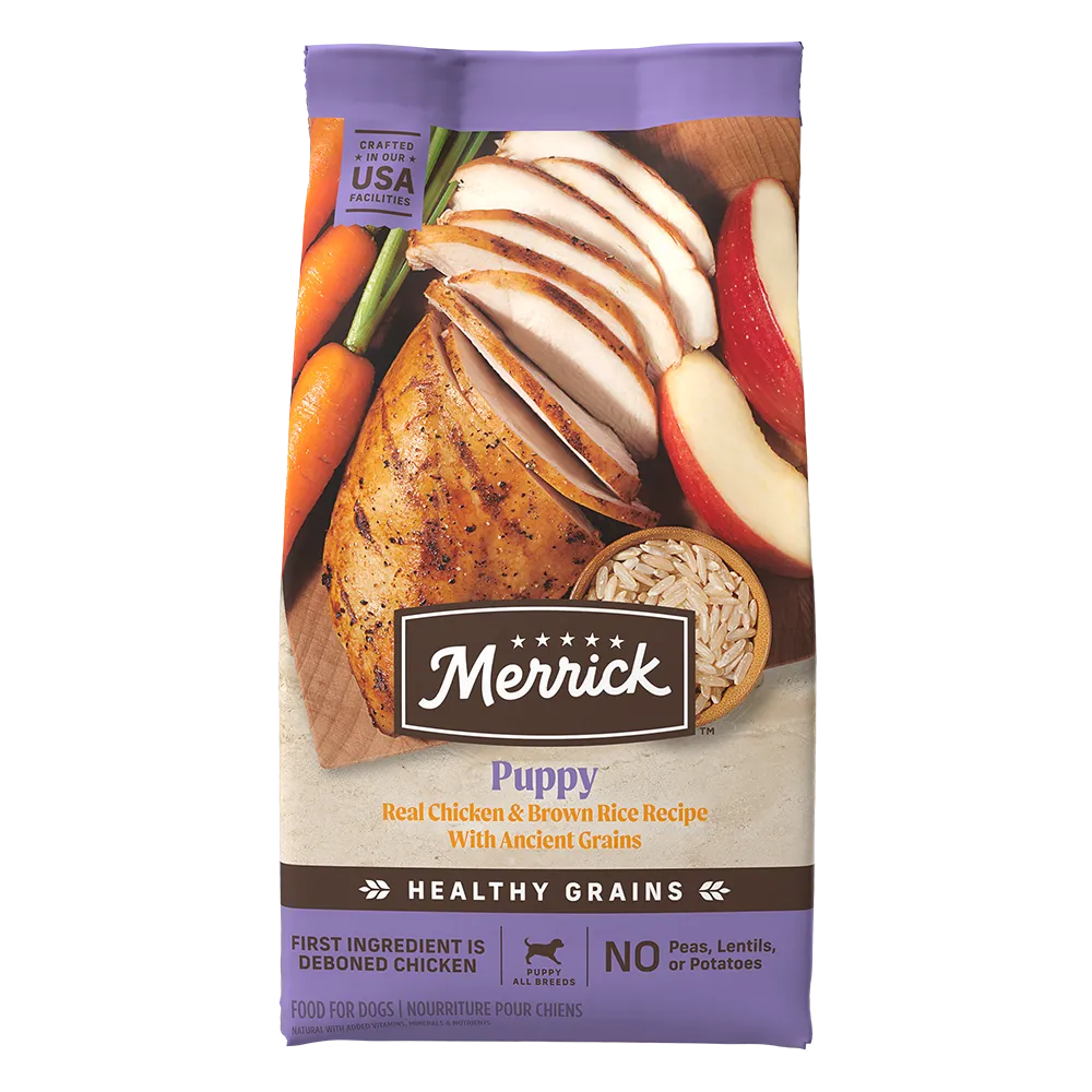 Every puppy parent wants to give their little friend all the nutrients they need to grow up strong and smart. This is why Merrick has specifically crafted puppy food to support their growth and development. These recipes carry high levels of protein to help develop healthy muscles and energy levels and dry recipes have added DHA to support brain development. Our recipes do not include corn, artificial flavors, or preservatives. Choose from our variety of nutritional options to find the best puppy food for your little one. Merrick offers recipes with healthy grains as well as grain free choices for puppies with different diets. Made with real ingredients and whole nutrition, you can confidently feed your new puppy Merrick dry dog food and wet dog food. Find the right balance of essential vitamins, minerals, and nutrients with Merrick natural puppy food.