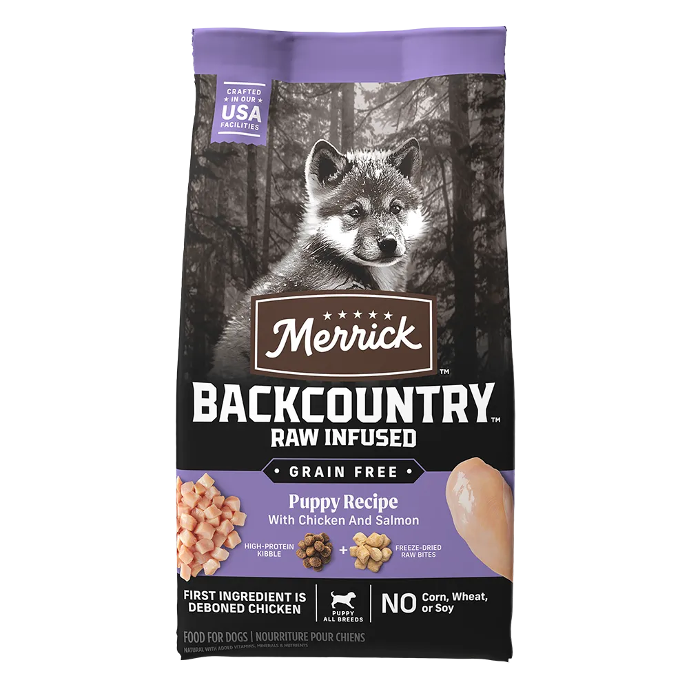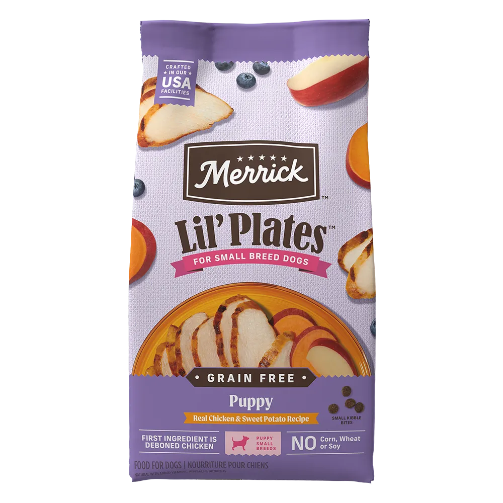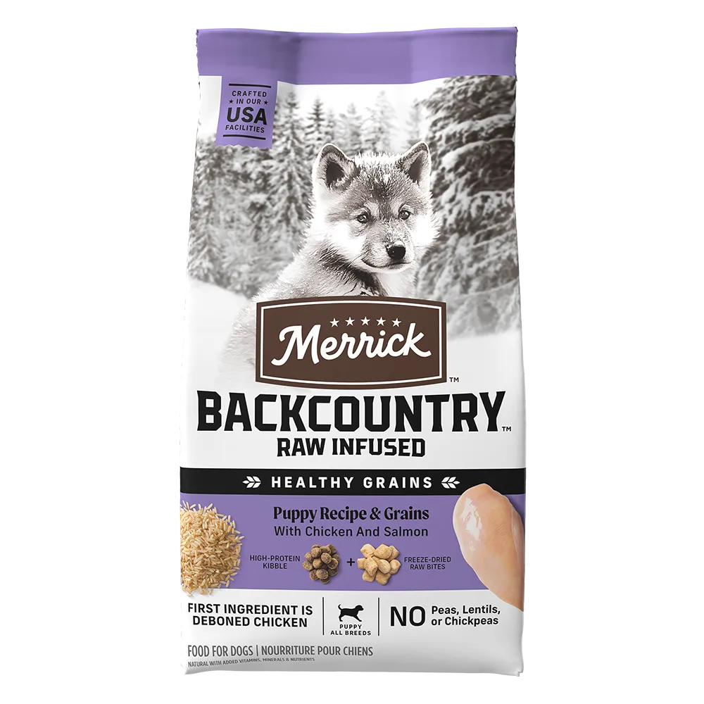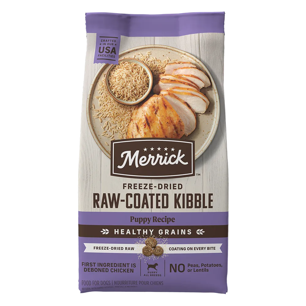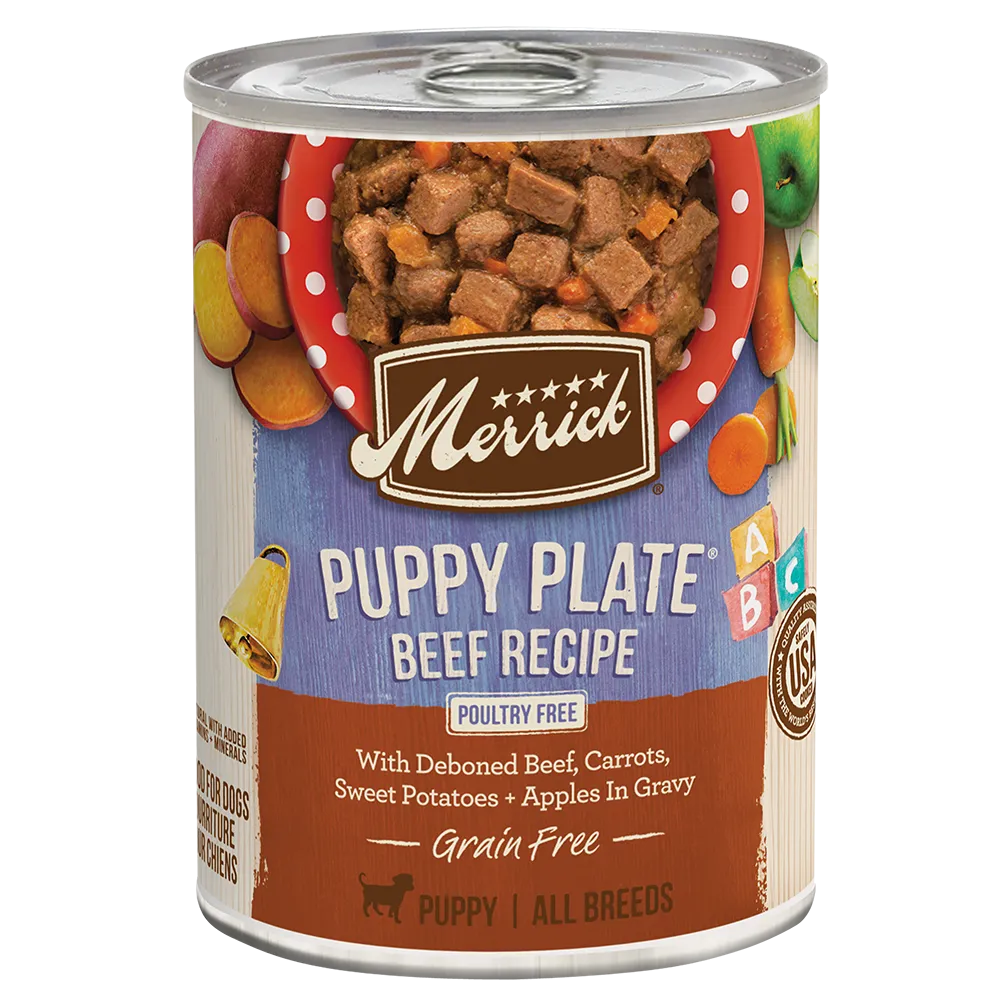 Every puppy parent wants to give their little friend all the nutrients they need to grow up strong and smart. This is why Merrick has specifically crafted puppy food to support their growth and development. These recipes carry high levels of protein to help develop healthy muscles and energy levels and dry recipes have added DHA to support brain development. Our recipes do not include corn, artificial flavors, or preservatives. Choose from our variety of nutritional options to find the best puppy food for your little one. Merrick offers recipes with healthy grains as well as grain free choices for puppies with different diets. Made with real ingredients and whole nutrition, you can confidently feed your new puppy Merrick dry dog food and wet dog food. Find the right balance of essential vitamins, minerals, and nutrients with Merrick natural puppy food.