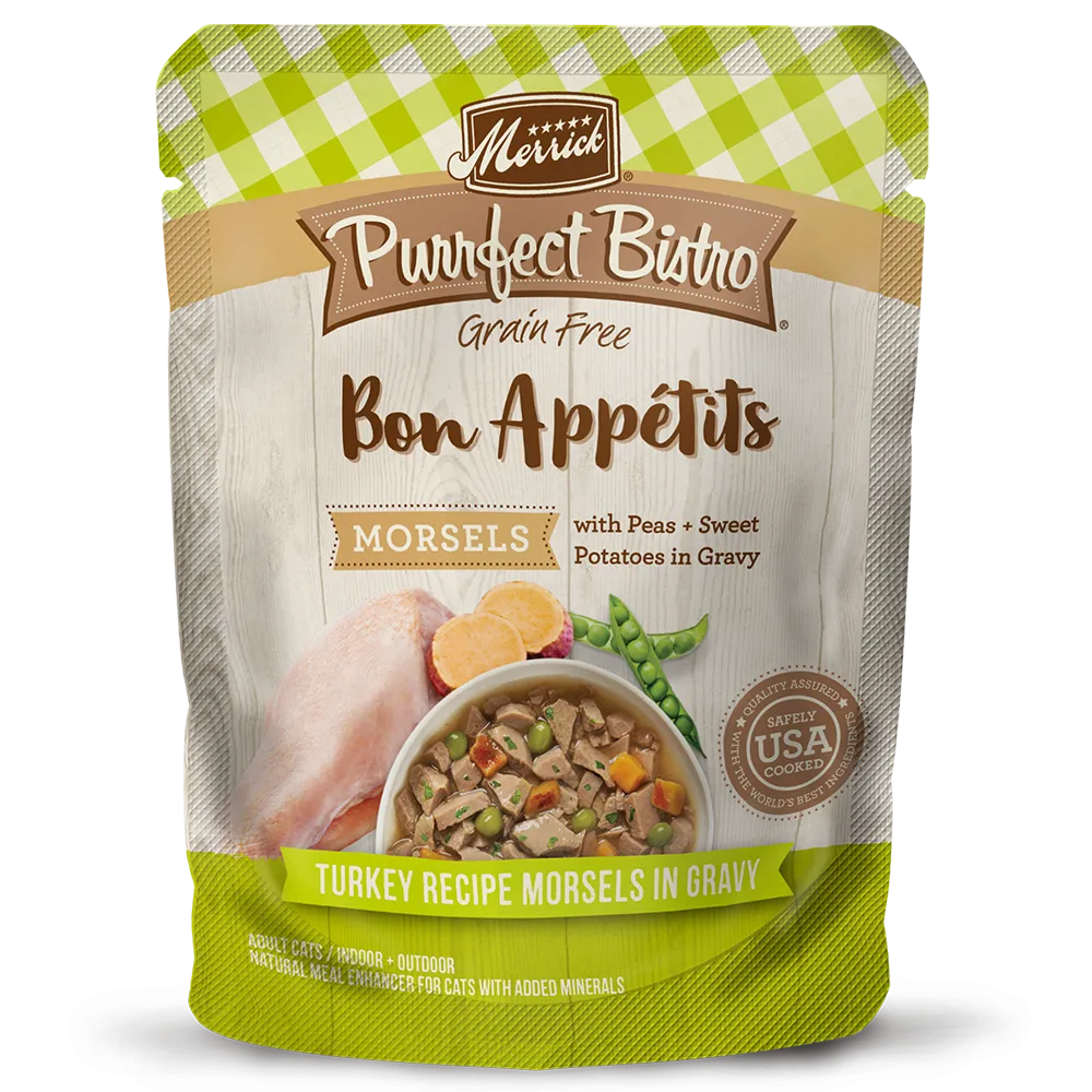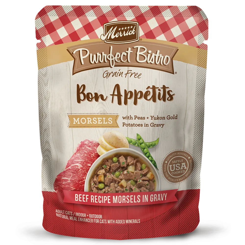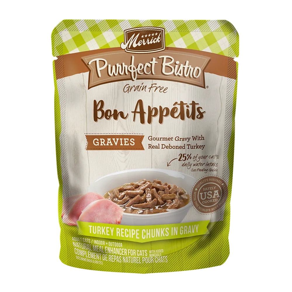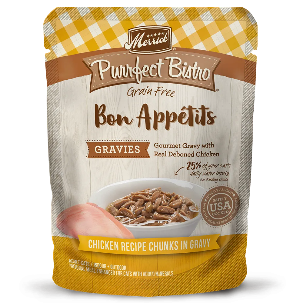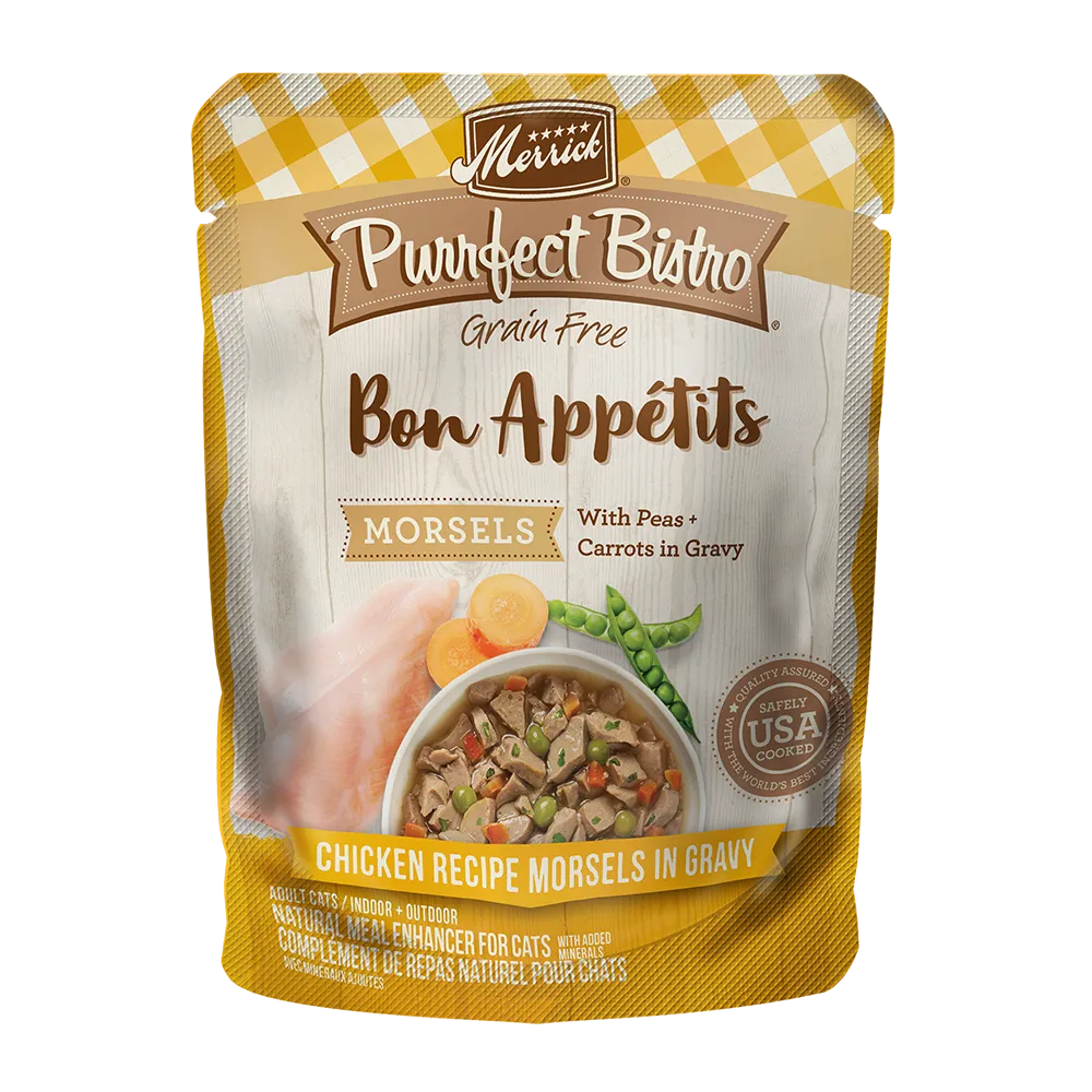 Merrick has crafted cat food toppers to add new flavors, new textures, and moisture to your cat’s everyday meals. Adding our Grain Free Bone Broth to your cat’s dry food is an easy way to boost their food’s flavor and give your cat added hydration. For a meatier addition to your cat’s meals, try Purrfect Bistro Bon Appetits Chunks in Gravy. These recipes have pieces made with meat, fish, or poultry as well as moisture that can help provide up to 25% of a cat’s daily water intake. Purrfect Bistro Bon Appetits Morsels in Gravy is another great option that also includes visible pieces of vegetables to add more flavors and textures to your cat’s meal. Browse below to find your cat’s next favorite cat food topper.