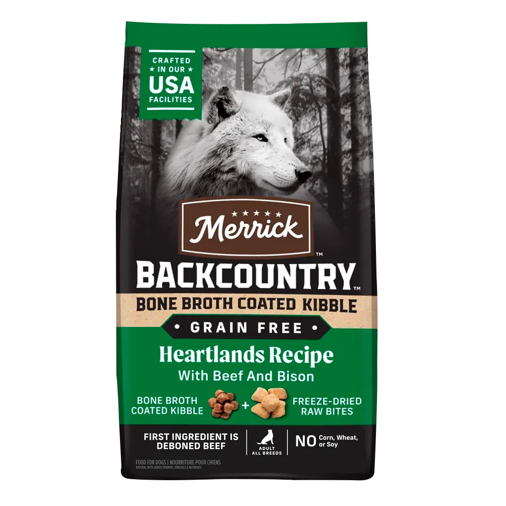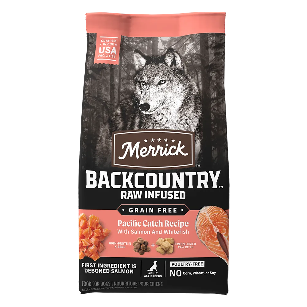 Looking to serve grain free high protein food to your dog? Merrick Backcountry offers both wet and dry grain free dog food that your dog will enjoy. Backcountry Grain Free recipes are made with deboned meat, fish or poultry and real ingredients like sweet potatoes, or carrots, and more to provide grain free nutrition that is complete and balanced with options for Puppy and Adult. Backcountry Raw Infused dry dog recipes have freeze-dried raw pieces mixed into the kibble for a delicious taste. Add moisture, texture, and flavors to your dog’s meals with Backcountry Grain Free wet options. Made with deboned meat, fish or poultry, these wet recipes are complete and balanced and are a great addition to your dog’s meals.