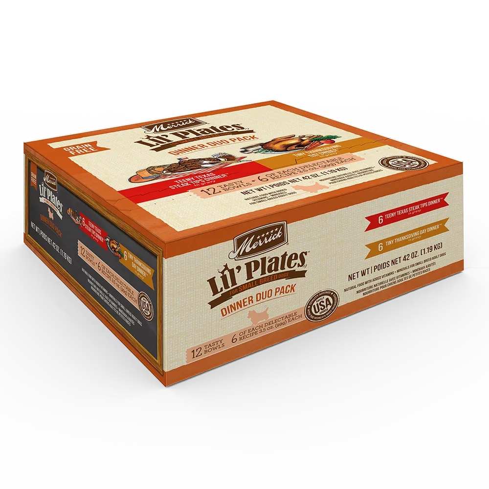 Merrick Lil’ Plates wet dog food is crafted to provide your small breed dog with a complete and balanced meal. These wet recipes expertly combine real whole nutrition with delicious taste in a variety of textures, flavors, and protein options. Choose between smooth pate recipes or morsels in gravy recipes for a hydrating wet recipe your small breed dog will love. Additionally, Lil’ Plates wet dog food recipes are grain free, made with high levels of quality protein, and crafted specifically for small breed dogs with smaller serving sizes.